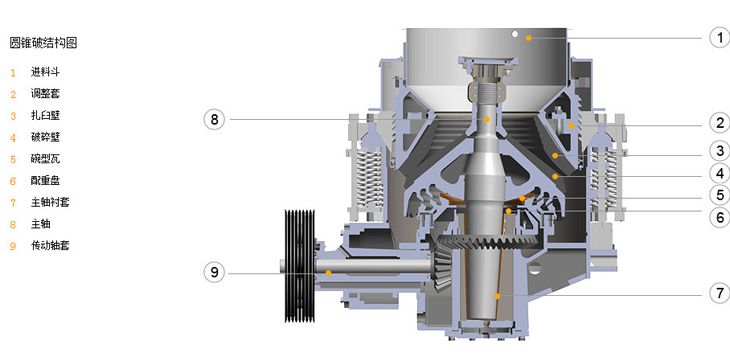 圓錐破碎機其結(jié)構(gòu)主要有機架、水平軸、動錐體、平衡輪、偏心套、上破碎壁(固定錐)、下破碎壁(動錐)、液力偶合器、潤滑系統(tǒng)、液壓系統(tǒng)、控制系統(tǒng)等幾部分組成。