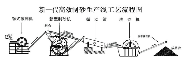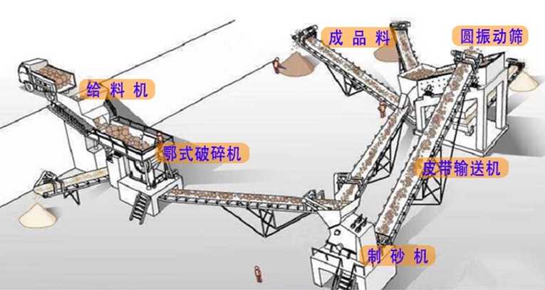 石料通過振動給料機(jī)均勻進(jìn)入粗顎式破碎機(jī)進(jìn)行初步破碎,產(chǎn)成的粗料由輸送機(jī)輸送至細(xì)碎機(jī)(可選配重型制砂機(jī)或立軸制砂機(jī))進(jìn)行進(jìn)第二步破碎,細(xì)碎后的石料進(jìn)振動篩篩分出各種規(guī)格的沙子、石子;然后進(jìn)入振動篩進(jìn)行篩分,滿足客戶要求的通過輸送機(jī)輸送至成品料區(qū),不滿足要求的重新進(jìn)入制砂機(jī)再次破碎,終產(chǎn)出符合要求的各種砂料(人工沙生產(chǎn)線)。